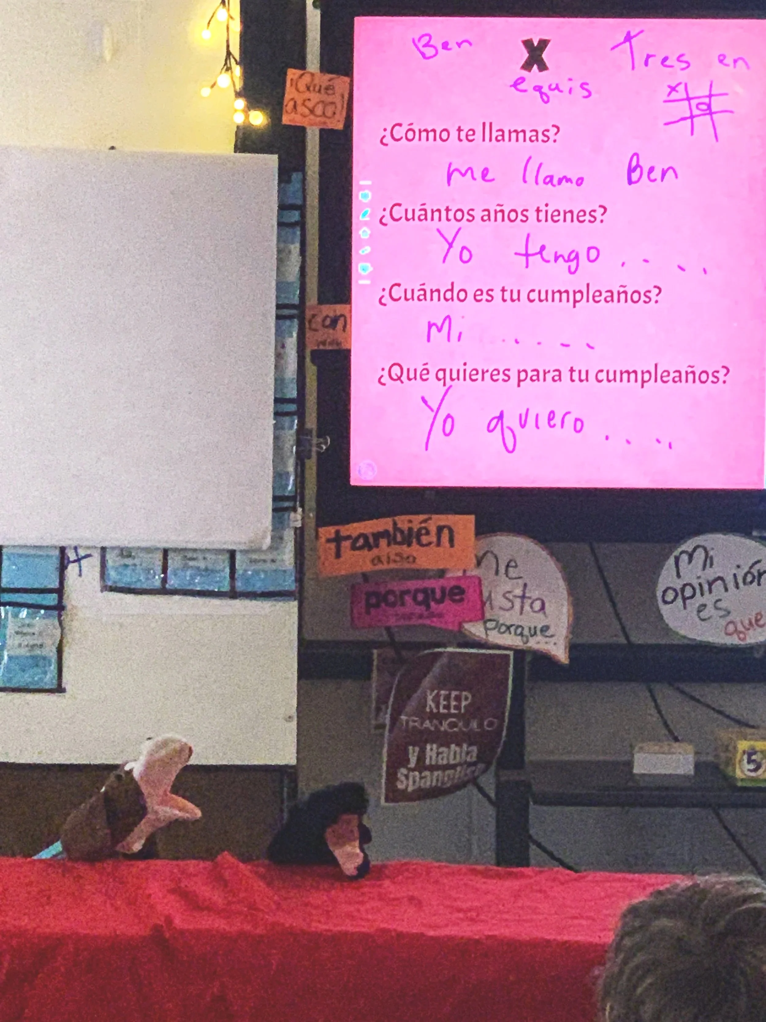 Puppet shows - kids loved this because they don’t have to be in front; they can hide behind the table I cover with a tablecloth. After the show, I ask students in the class comprehension questions for additional input, and reward participation card points.