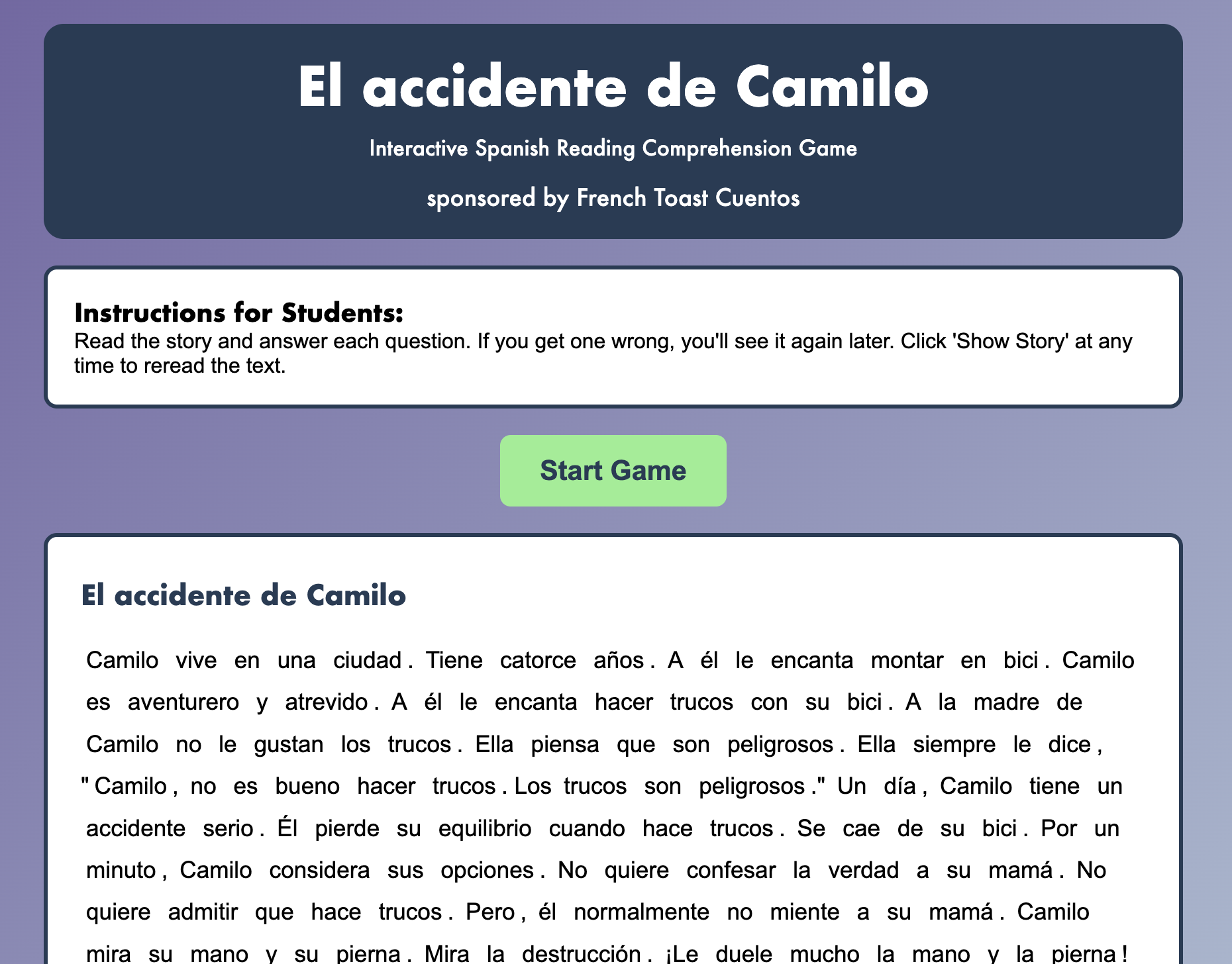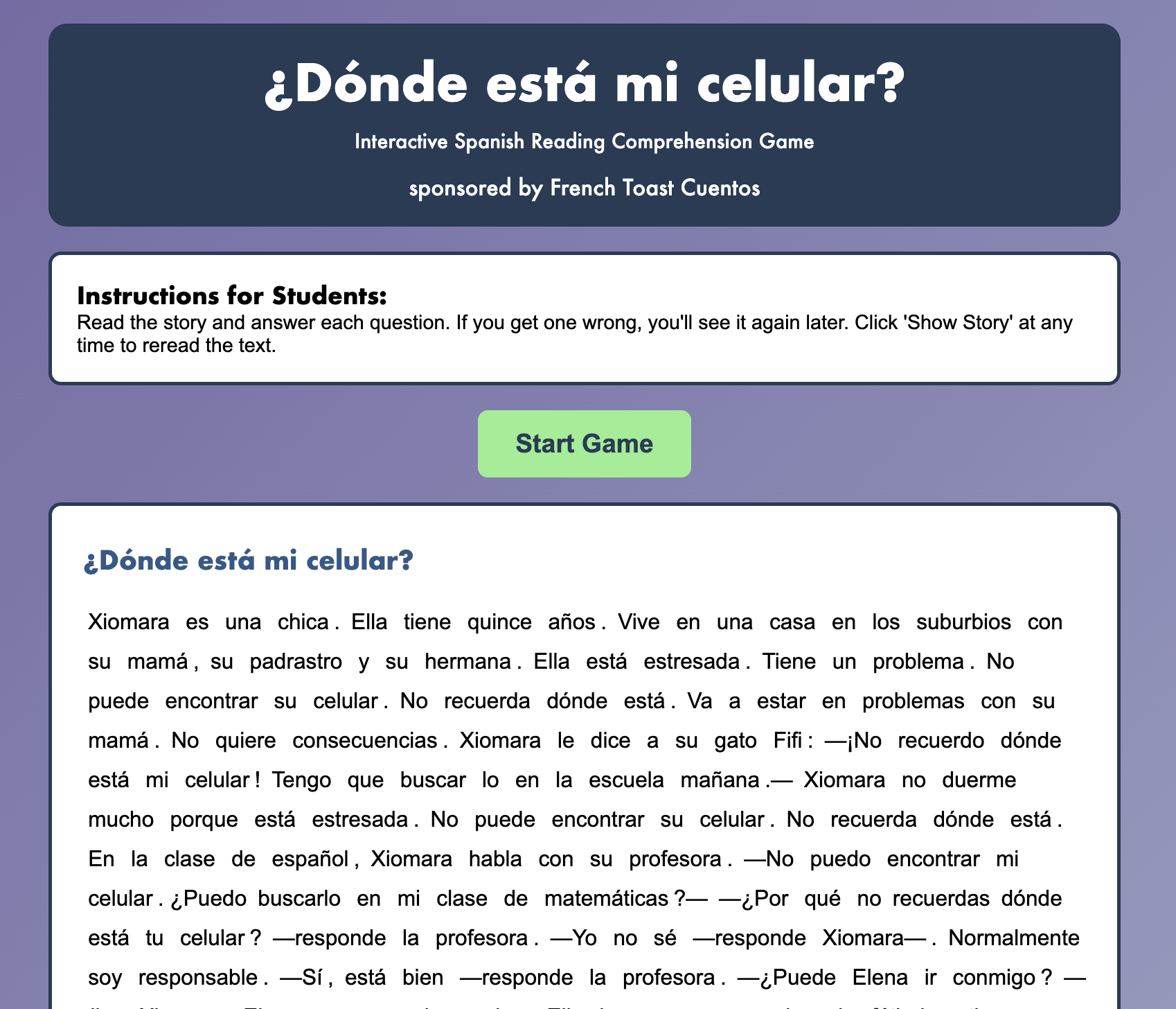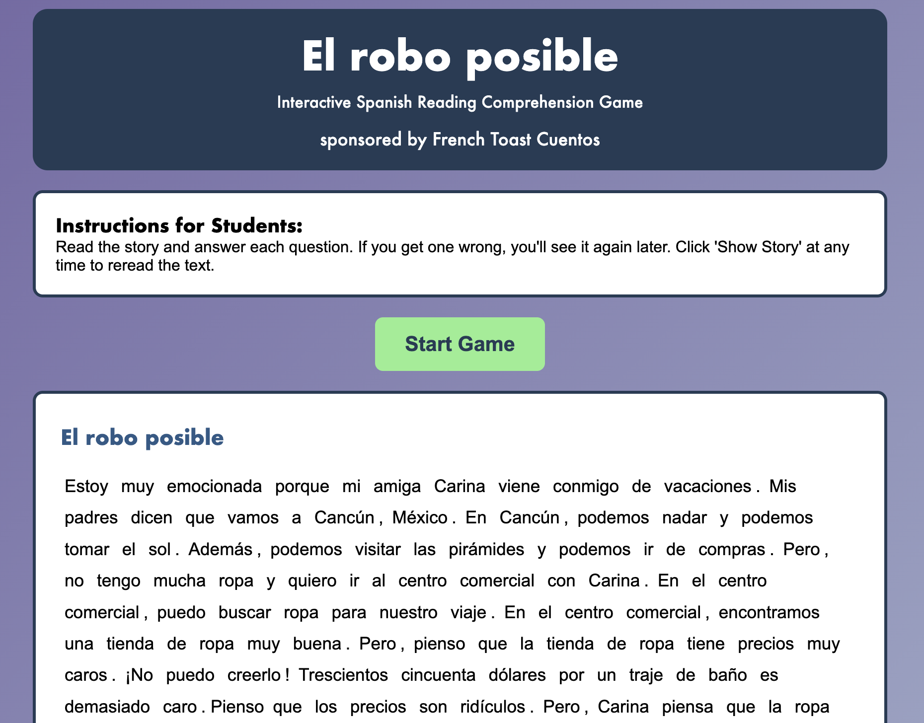 Students can hover over each word in the story to see its translation, keeping things as comprehensible as possible.